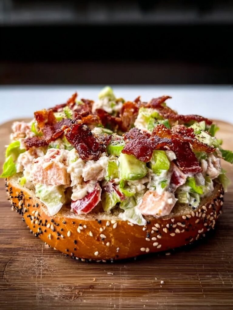 Nehmen Sie die getoasteten Bagelhälften und belegen Sie jede Seite großzügig mit demCalifornia BLT Chopped BagelSalat. Stapeln Sie den Belag hoch, da er in sich stabil ist. Servieren Sie ihn sofort, solange die Bagels noch warm und die Truthahnstreifen noch knackig sind.