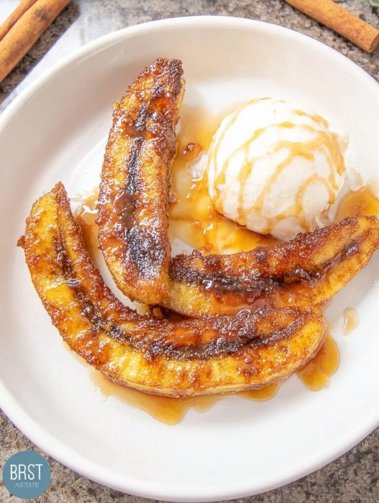 Nehmen Sie die Bananen vorsichtig aus dem Korb (sie sind sehr heiß und weich!) und transferieren Sie sie auf Teller. Servieren Sie sie sofort. Für den perfekten Abschluss passt eine Kugel Vanilleeis oder ein Klecks griechischer Joghurt hervorragend dazu, um den warmen Karamell zu ergänzen.