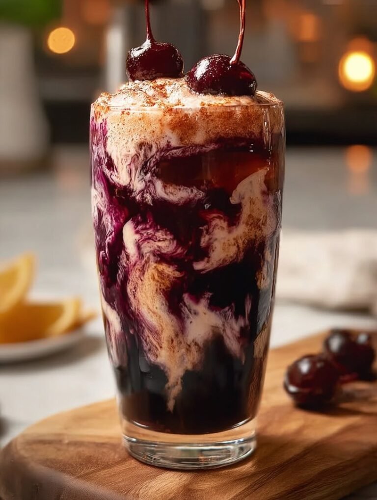 - Servieren Sie den „Dirty Soda“ in einem hohen, gekühlten Glas und garnieren Sie ihn großzügig mit den Maraschino-Kirschen, um den optischen Kontrast zu betonen.