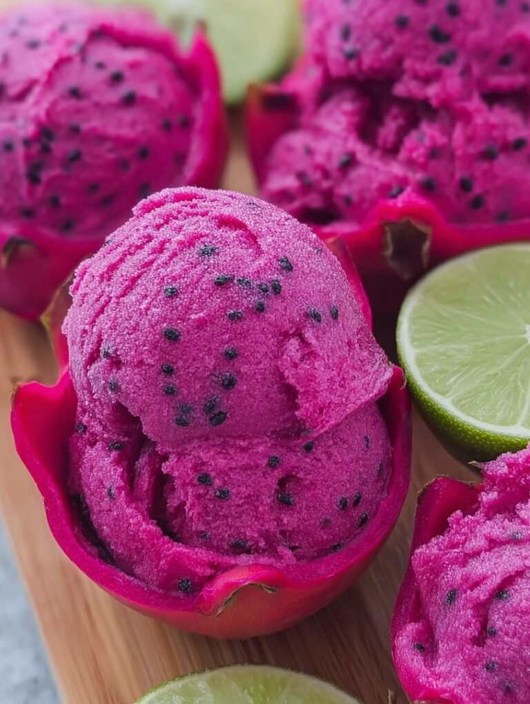 Tauchen Sie ein in die Tropen! Dieses pinke Drachenfruchtsorbet nutzt die natürliche Süße der Pitahaya, kombiniert mit Limette und hausgemachtem Sirup. Cremig, erfrischend und einfach zuzubereiten.