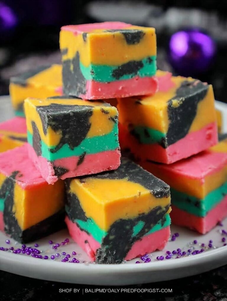 - Dieses auffällige Fudge macht sich hervorragend als Hingucker auf einem schaurigen October Festival-Desserttisch oder serviert auf kleinen, schwarzen Papierförmchen.