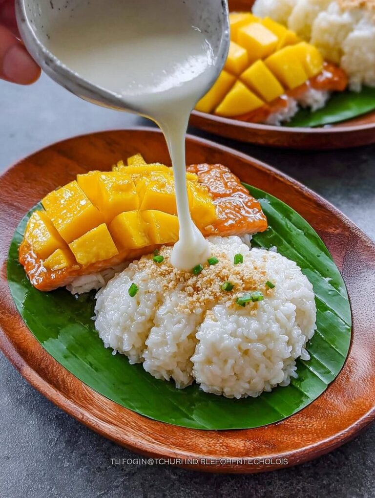 Schäle die reifen Mangos und schneide sie in schöne Scheiben oder Würfel. Richte den durchgezogenen, cremigen Klebreis auf Tellern an. Lege die Mangoscheiben elegant daneben oder darauf. Gieße den restlichen Teil der Kokossoße über den Reis oder serviere ihn separat in einer kleinen Schale als zusätzliche Drizzle-Soße.
