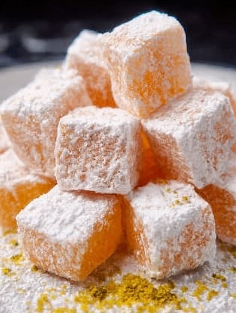 Nachdem das Lokum vollständig ausgehärtet ist, stürzen Sie es auf eine großzügig mit Puderzucker und Maisstärke bestäubte Arbeitsfläche. Schneiden Sie es mit einem scharfen, leicht eingeölten Messer in mundgerechte Quadrate. Rollen Sie jedes Stück sorgfältig in der Puderzuckermischung, um es vollständig zu umhüllen und ein Zusammenkleben zu verhindern. Jetzt ist der Moment gekommen, diesen sonnigen Genuss zu probieren!